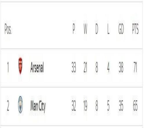 在33輪之后,阿森納以70分繼續(xù)領(lǐng)跑,但僅領(lǐng)先少賽一場的曼城3分。同時,在凈勝球方面,阿森納也以1球的優(yōu)勢領(lǐng)先。