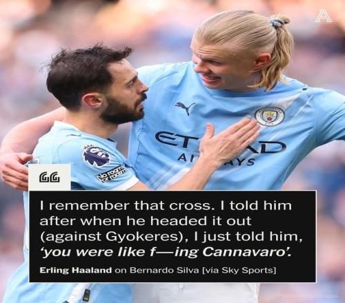 賽后,在接受天空體育采訪,談及伯納多-席爾瓦的關(guān)鍵解圍時,哈蘭德說道:“我記得那個解圍,他頭球解圍后我跟他說,你剛才就像‘該死的卡納瓦羅’。”