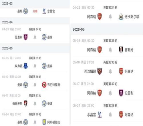后續(xù)賽程的對(duì)比,更是讓爭(zhēng)冠懸念進(jìn)一步升級(jí)。曼城將迎戰(zhàn)阿斯頓維拉,而阿森納則要對(duì)陣紐卡斯?fàn)柭?lián)。