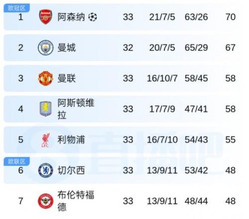 積分榜上,曼城少賽1場(chǎng)積67分仍居第2,阿森納積70分繼續(xù)領(lǐng)跑,但多賽一輪的他們,領(lǐng)先優(yōu)勢(shì)已被縮小至僅3分,英超爭(zhēng)冠正式進(jìn)入白熱化階段。