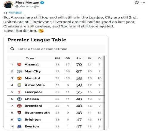 作為知名槍迷,摩根在社媒發(fā)文力挺阿森納,他堅(jiān)定表示:“阿森納依舊穩(wěn)居榜首,依然將贏得聯(lián)賽冠軍。曼城還是第二,曼聯(lián)依然無(wú)關(guān)緊要;利物浦還是實(shí)力只剩去年一半;切爾西依舊一無(wú)是處;熱刺依然遲早降級(jí)?!?/p>