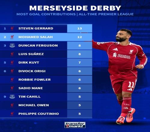 默西賽德郡德比歷史射手榜:杰拉德13球、薩拉赫12球、蘇牙8球