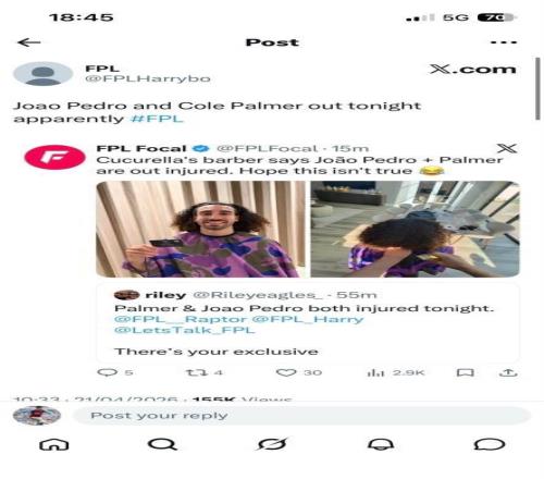 當?shù)貢r間周二早些時候,庫庫雷利亞的理發(fā)師在社交媒體發(fā)布了這一消息,他寫道:“帕爾默和若昂-佩德羅今晚雙雙因傷缺陣了。這是給你們的獨家消息(艾特FPL資訊賬號)?!迸鋱D則是他正在為庫庫雷利亞修剪頭發(fā)的照片。