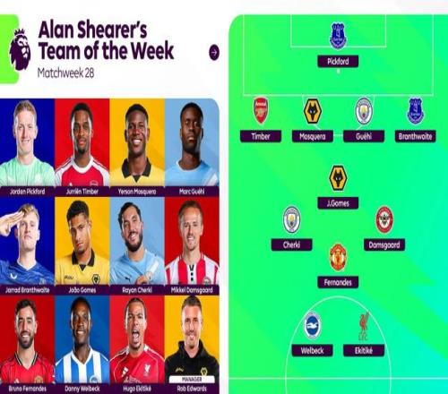 英超聯(lián)賽官方公布了阿蘭-希勒評選的第28輪最佳陣容,?;倏?、布魯諾-費爾南德斯、謝爾基、廷貝爾等人在列。