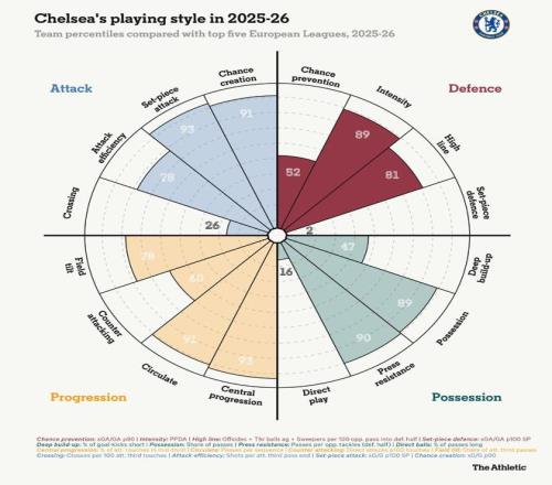The Athletic最新更新的比賽風格分布圖有助于將這一弱點置于背景中。雖然我們可以看到切爾西是一支強大的控球型球隊,在馬雷斯卡和羅塞尼爾指導下能夠很好地傳導球以創(chuàng)造高質量機會,但在防守定位球方面,他們發(fā)現(xiàn)自己處于歐洲五大聯(lián)賽所有球隊中墊底的2%之列。