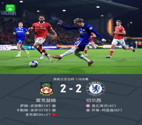 北京時間3月8日英格蘭足總杯 1/8決賽,雷克瑟姆對陣切爾西。上半場,史密斯單刀破門,加納喬打門造烏龍。下半場,多伊爾腳后跟破門,隨后,阿昌龐爆射破門,再次扳平。常規(guī)時間比分雷克瑟姆 2-2 切爾西。