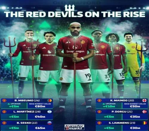 曼聯(lián)全隊身價上漲3500萬歐,其中梅努漲1000萬歐為漲幅最大