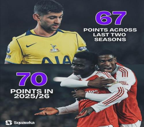 Squawka統(tǒng)計(jì),戰(zhàn)勝埃弗頓之后,阿森納本賽季英超積分達(dá)到70分,比熱刺最近兩個(gè)賽季的積分總和還多!