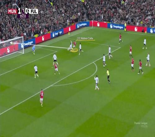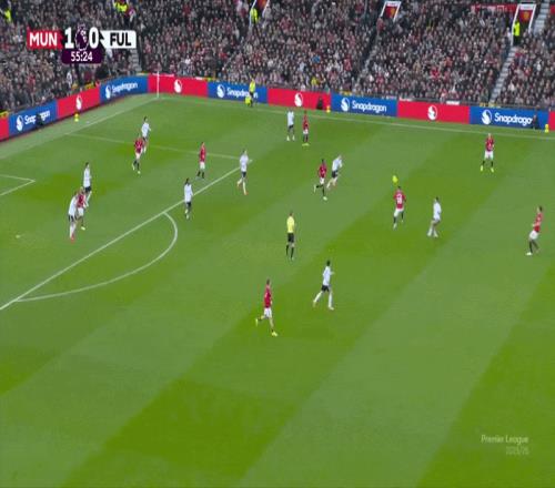 此處,庫尼亞向內(nèi)切,費爾南德斯向邊線移動,曼聯(lián)從右路進攻。隨后阿馬德重新組織攻勢,暫時扮演起“10號位”(中路組織者)的角色,將姆伯莫換位到左側(cè)。