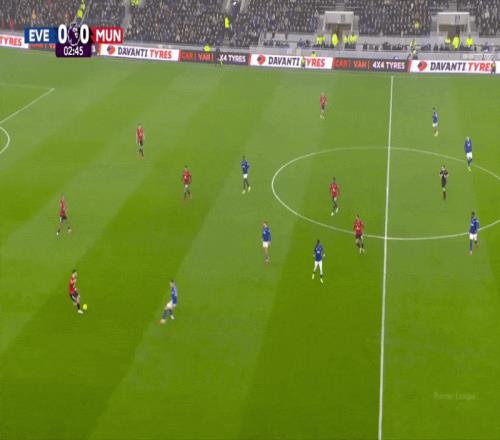 曼聯(lián)前場四人組的自由度幫助球隊將球推進到前場,如下面二月的1比0戰(zhàn)勝埃弗頓的例子所示。