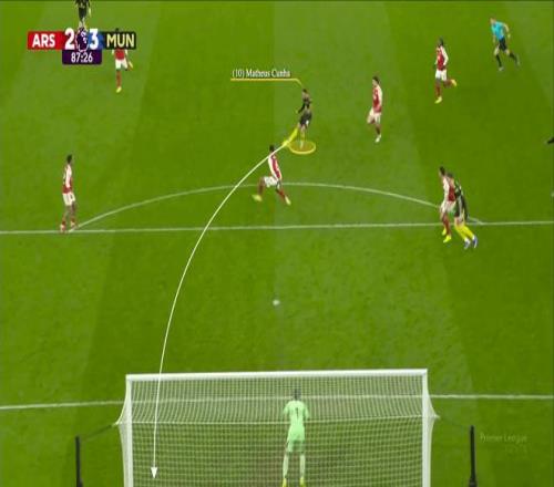 布魯諾-費爾南德斯控制住球后,庫尼亞沖向場內(nèi),插入阿森納中場與防線之間的空當(dāng)。本-懷特最初在盯防庫尼亞,但費爾南德斯將球傳給梅努后的跑動,讓阿森納右后衛(wèi)陷入了1對2的局面。