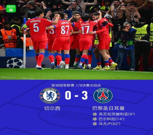 北京時(shí)間3月18日歐洲冠軍聯(lián)賽 1/8決賽次回合,切爾西對(duì)陣巴黎圣日耳曼。巴黎圣日耳曼克瓦拉茨赫利亞破門,巴爾科拉破門,馬尤盧破門。最終比分切爾西 0-3 巴黎圣日耳曼。兩回合總比分切爾西2-8巴黎圣日耳曼。