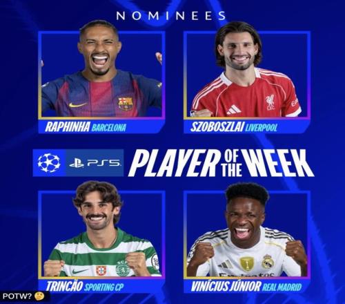 本周歐冠最佳球員候選:拉菲尼亞、索博、特林康、維尼修斯