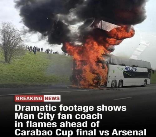 曼城球迷大巴英聯(lián)杯決賽前在高速上起火,所幸無人受傷