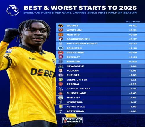 體育播報(bào)3月27日宣 德國(guó)轉(zhuǎn)會(huì)市場(chǎng)統(tǒng)計(jì)了2026年英超球隊(duì)的場(chǎng)均積分,并與球隊(duì)上半賽季的場(chǎng)均積分比較,列出英超球隊(duì)場(chǎng)均積分變化排名,狼隊(duì)+1.01分居首,熱刺-1分墊底。