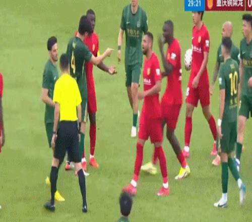 雙方球員隨即一擁而上,發(fā)生了口角,浙江隊(duì)球員集體質(zhì)疑主裁判的判罰。起身之后,米特里策大罵仍然倒在草坪上的李鎮(zhèn)全,再次引發(fā)了雙方球員的沖突。