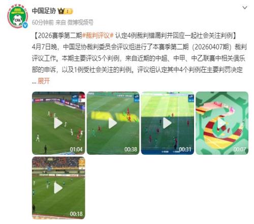4月8日下午,中國足協公布了2026賽季第二期裁判評議結果,認定4例裁判錯漏判,并回應一起社會關注判例。其中,與中超賽場有關的3個判例中,2個出現錯漏判。