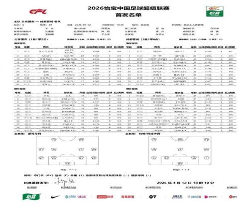 北京時間4月12日19:35,中超聯(lián)賽第5輪,北京國安將坐鎮(zhèn)主場迎戰(zhàn)成都蓉城,本場比賽主裁判是王競,VAR是沈寅豪,賽前雙方公布首發(fā):