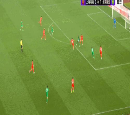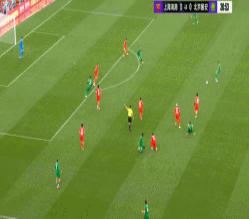 上半場第29分鐘,海港右路傳中制造國安禁區(qū)內(nèi)混亂,皮球幾次反彈后打中國安門柱。