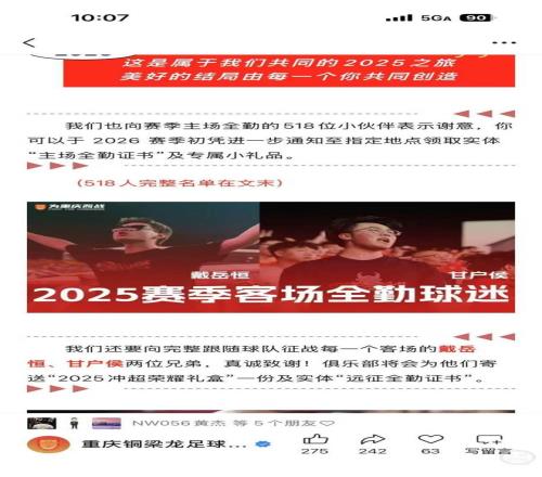 甘戶侯也表示:“其實(shí)完成全部客場(chǎng),我沒有把它當(dāng)成什么壯舉??蛨?chǎng)本來就比主場(chǎng)更難踢,長(zhǎng)途奔波、陌生場(chǎng)地、主場(chǎng)球迷的壓力等等,都會(huì)讓比賽變得更艱難。所以對(duì)我來說,去客場(chǎng)看球反而不是最重要的事情,最重要的是我們能不能把重慶的聲音帶過去。我們一直相信,看臺(tái)上的助威是有力量的,哪怕只有幾個(gè)人,但只要聲音在,球隊(duì)就不會(huì)覺得自己是孤軍奮戰(zhàn)?!?/p>