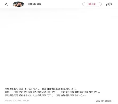 邦本萌寫道:“我真的很不甘心,眼淚都流出來了。他一直在為球隊拼盡全力,我知道他有多努力。只是現(xiàn)在什么也做不了,真的很不甘心。