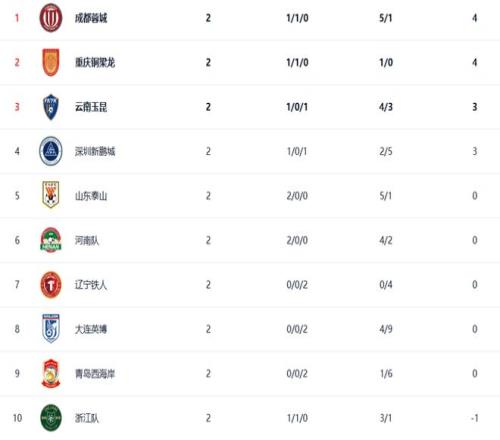 云南玉昆、深圳新鵬城同積3分,分別排名第3、4位,山東泰山排名第5位。前兩戰(zhàn)一平一負(fù)的青島海牛(-6分)、天津津門虎(-9分)分居后兩位,一勝一平的上海申花則以-6的積分排名第14位。