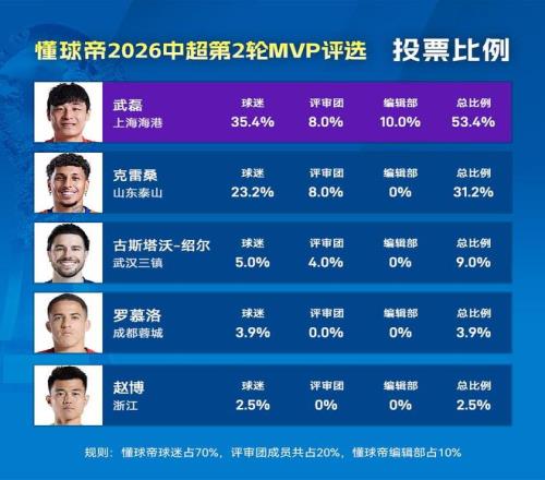 大家好,歡迎來到懂球帝2026賽季中超MVP的評(píng)選現(xiàn)場。在本賽季的第2輪MVP評(píng)選中,傷愈復(fù)出的“武球王”以53.4%的高得票率成功當(dāng)選本輪MVP,這也是武磊第22次當(dāng)選懂球帝MVP。