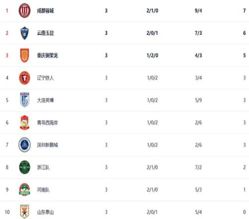 前3輪之后,成都蓉城以7分繼續(xù)領跑積分榜,云南玉昆(6分)、重慶銅梁龍(5分)排名第2、3位,遼寧鐵人、大連英博、青島西海岸、深圳新鵬城同積3分。