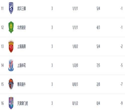 津門虎以-9分在積分榜上墊底,三連敗的青島海牛則以-7分排名第15位,海港(-2)、申花(-5)分別排名第13、第14位。