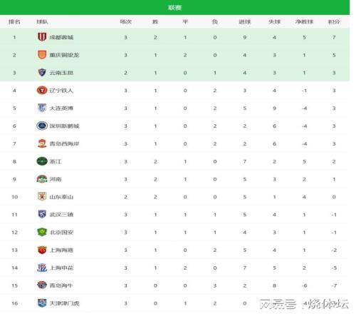 中超積分榜:西南三強占據(jù)前三,2隊實現(xiàn)積分轉正,1隊遭3連敗