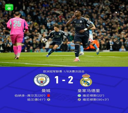 北京時(shí)間3月18日歐洲冠軍聯(lián)賽 1/8決賽次回合,曼城對(duì)陣皇家馬德里。上半場,B席獲紅點(diǎn)套餐后維尼修斯主罰命中,多...