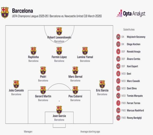 歐冠1/8決賽次回合,巴塞羅那主場對陣紐卡斯爾聯(lián),此役巴薩首發(fā)平均年齡為25歲18天,這是巴薩隊史歐冠淘汰賽最年...