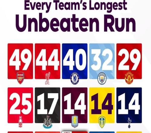 各隊(duì)英超最長(zhǎng)不敗紀(jì)錄:阿森納49場(chǎng),利物浦44場(chǎng),切爾西40場(chǎng)