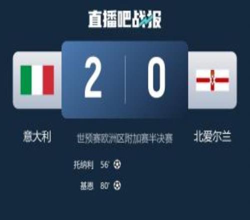 體育播報03月27日宣 世預賽歐洲區(qū)附加賽半決賽,意大利隊主場2-0北愛爾蘭,晉級附加賽決賽,距晉級正賽僅一步之遙...