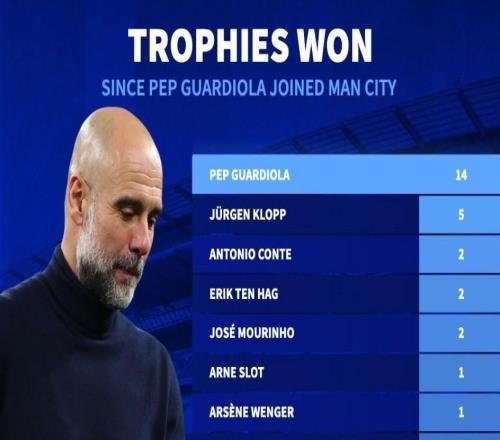 自接手曼城以來瓜迪奧拉14次奪冠,同期英超所有教練第一