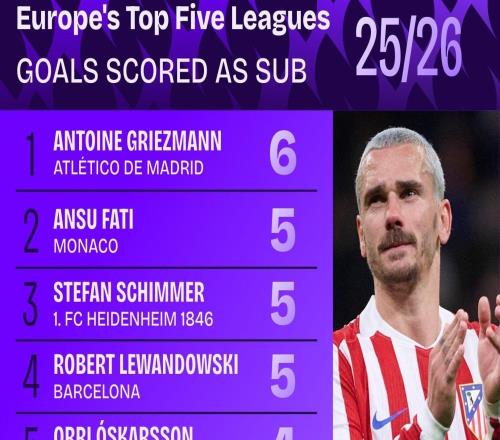 據(jù)統(tǒng)計,馬德里競技前鋒格列茲曼是本賽季歐洲五大聯(lián)賽作為替補取得進球最多的球員。2025/26賽季五大聯(lián)賽替補...