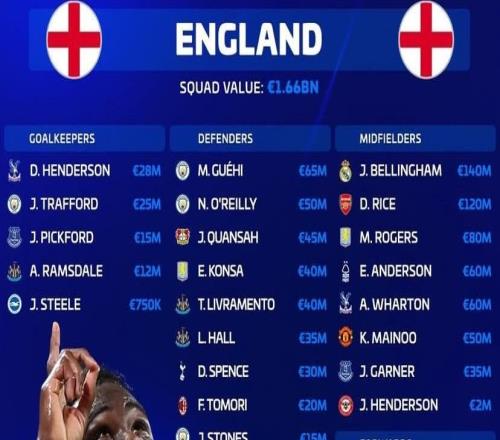 北京時間3月21日,在英格蘭代表隊公布新一期大名單之后,德轉(zhuǎn)列出了英格蘭隊此次35人大名單的身價排行榜,貝林厄...