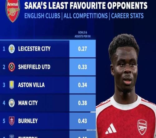 薩卡14次對陣曼城只造4球,生涯英格蘭范圍內(nèi)所有對手第四低