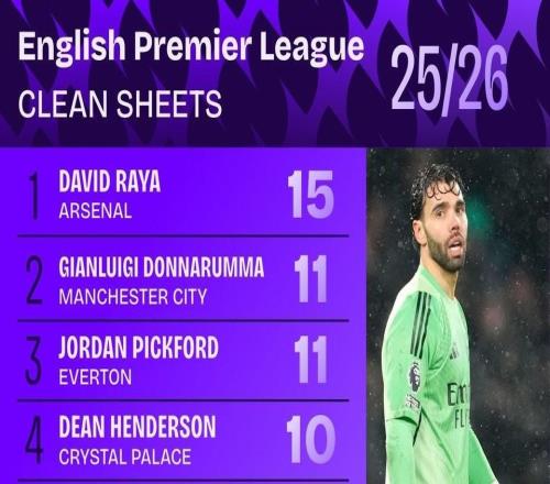 本賽季英超零封榜:拉亞15次第1,多納魯馬、皮克福德11次第2