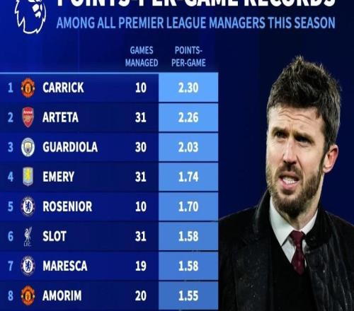 北京時(shí)間3月25日,德轉(zhuǎn)統(tǒng)計(jì)出了本賽季在英超至少執(zhí)教3場(chǎng)比賽的26位主帥場(chǎng)均積分,曼聯(lián)新帥卡里克執(zhí)教10場(chǎng)場(chǎng)均2....